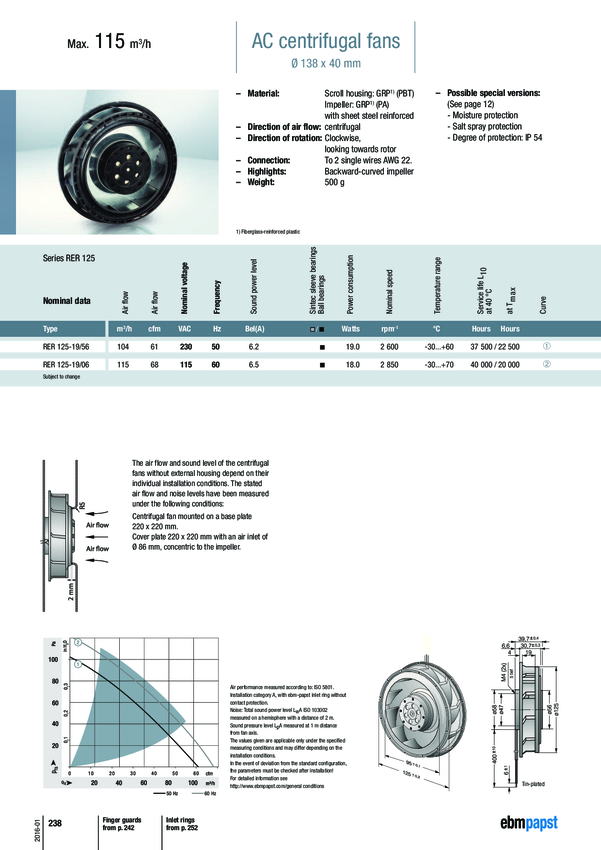 AC Motorized Impeller Ball Bearing 230V 19W 50Hz 2600RPM 61.2CFM 65dB Flange Mount