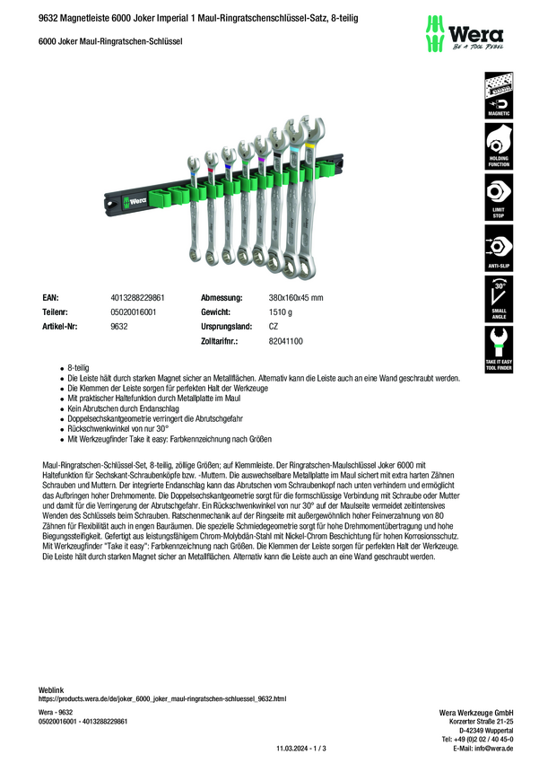 Wera 05020016001 9632 Magnetleiste 6000 Joker Imperial 1 Zestaw kluczy oczkowych 8 szt. Rozmiar klucza (metryczny) (tylk