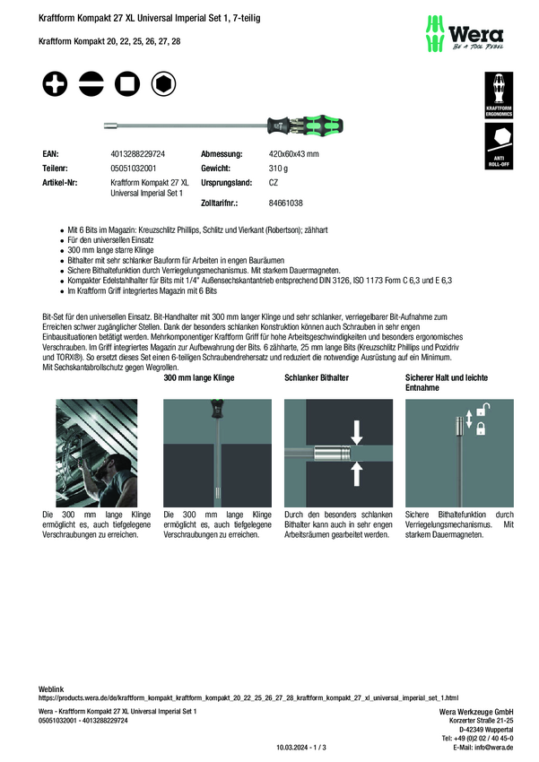 Wkrętak do bitów Wera Kraftform Kompakt 27 XL Universal Imperial Set 1 05051032001 produkt uniwersalny 1/4" 300 mm