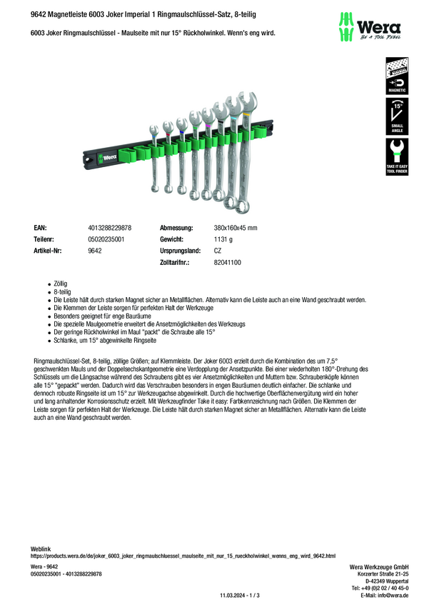 Wera 05020235001 9642 Magnetleiste 6003 Joker Imperial 1 Zestaw kluczy płasko oczkowych 8 szt. Rozmiar klucza (cale) (ty