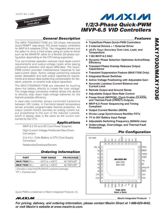 MAX17030, MAX17036 1/2/3-Phase Quick-PWM IMVP-6.5 VID Controllers