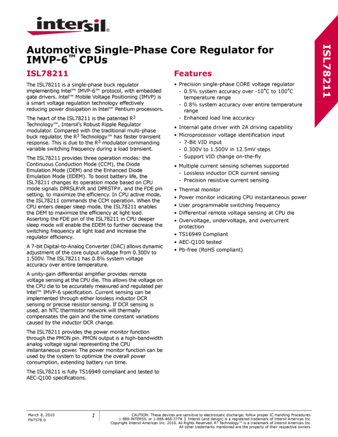 Automotive Single-Phase Core Regulator for IMVP-6™ CPUs
