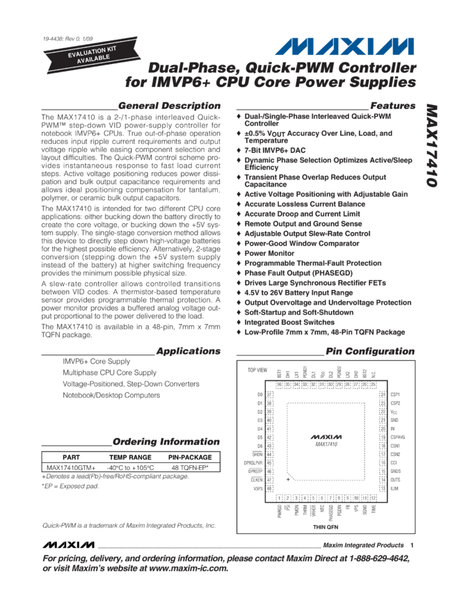 MAX17410 Dual-Phase, Quick-PWM Controller for IMVP6+ CPU Core Power Supplies