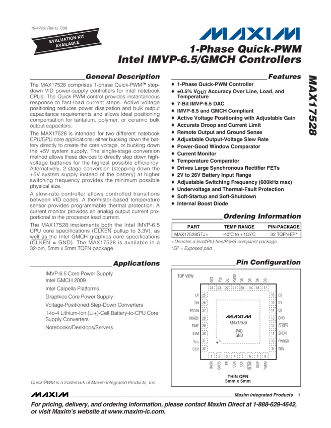 MAX17528 1-Phase, Quick-PWM Intel IMVP-6.5/GMCH Controllers