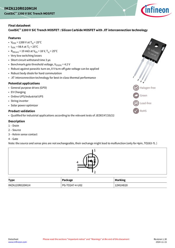 CoolSiC™ 1200 V, 20 mΩ SiC Trench MOSFET in TO247-4 package CoolSiC™ MOSFET discrete 1200 V, 20 mΩ G1 in TO247-4 package build on a state-of-the-art trench semiconductor process optimized to combine performance with reliability. The SiC MOSFET offers the lowest gate charge and device capacitance levels seen in 1200 V switches, no reverse recovery losses of the internal commutation proof body diode, temperature independent low switching losses, and threshold-free on-state characteristic.