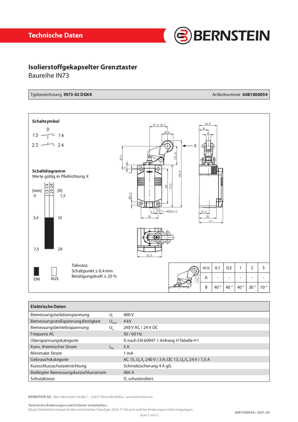 Bernstein 6081000054 IN73-02 DGKK Przełącznik pozycyjny 240 V/AC, 24 V/DC 5 A dźwignia rolkowa chwilowy IP66, IP67 1 szt