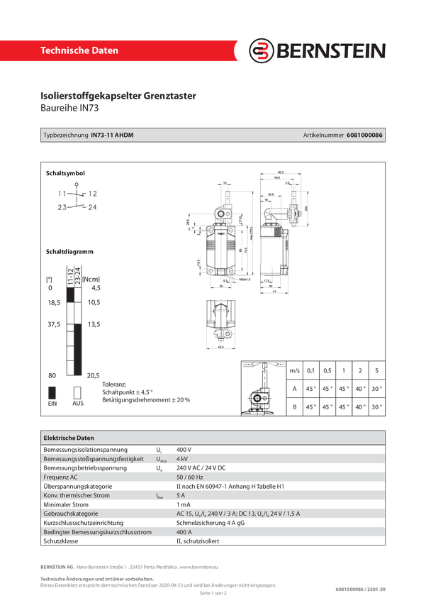 Bernstein 6081000086 IN73-11 AHDM Przełącznik pozycyjny 240 V/AC, 24 V/DC 5 A ramię prętu chwilowy IP66, IP67 1 szt.