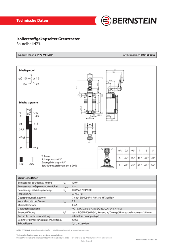 Bernstein 6081000067 IN73-V11 AHK Przełącznik pozycyjny 240 V/AC, 24 V/DC 5 A dźwignia obrotowa chwilowy IP66, IP67 1 sz