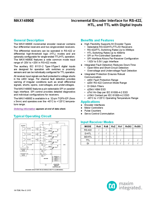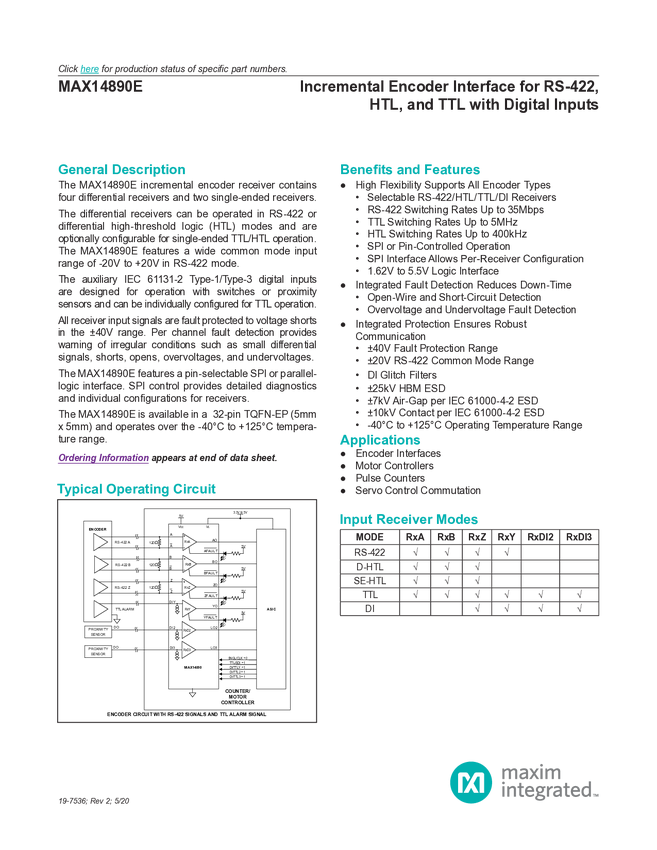 MAX14890E Incremental Encoder Interface for RS-422, HTL, and TTL with Digital Inputs