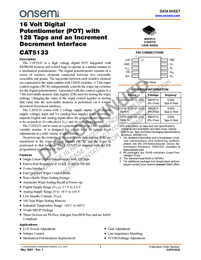 Digital Potentiometer (POT), 128-Tap, with Increment Decrement Interface