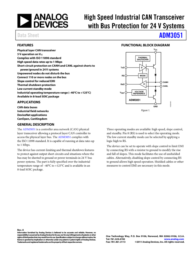 ADM3051: High Speed Industrial CAN Transceiver with Bus Protection for 24 V Systems