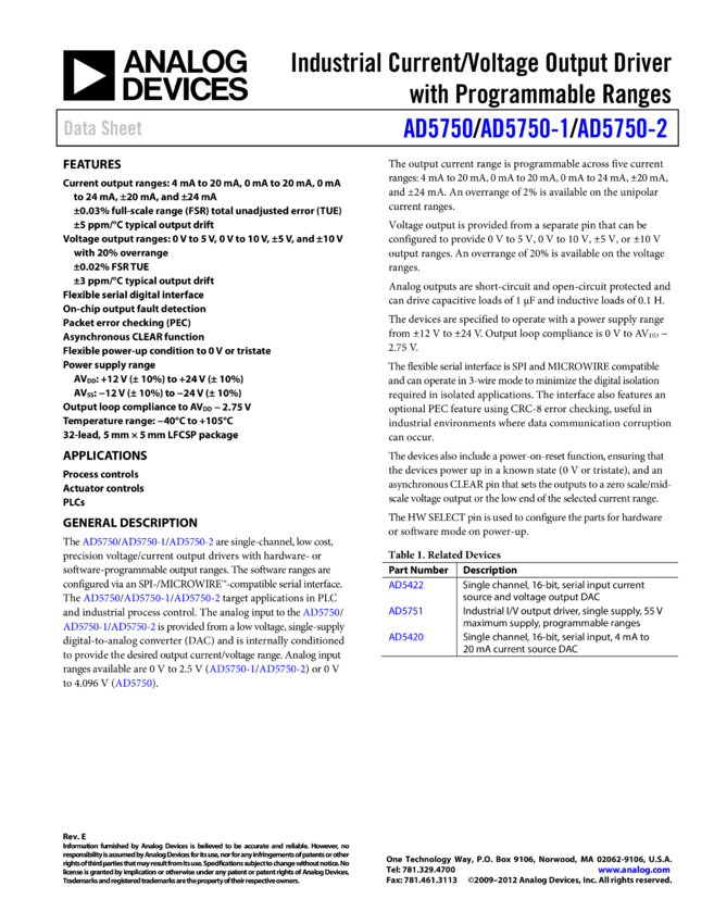 AD5750-1: Industrial Current/Voltage Output Driver with Programmable Ranges