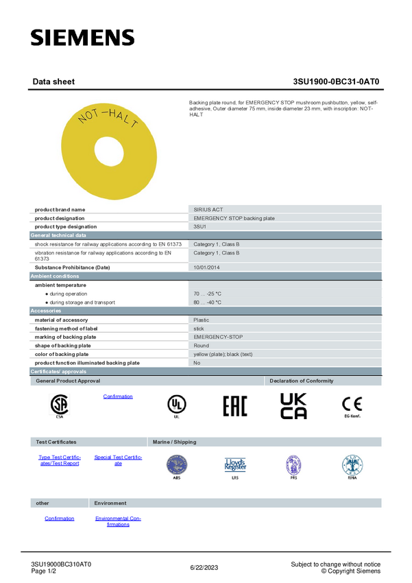 Podkładka indentyfikacyjna Siemens 3SU1900-0BC31-0MA0 (Ø) 75 mm NOT-AUS 10 szt.