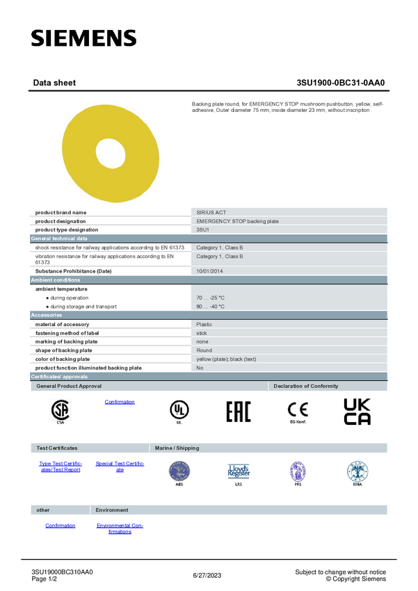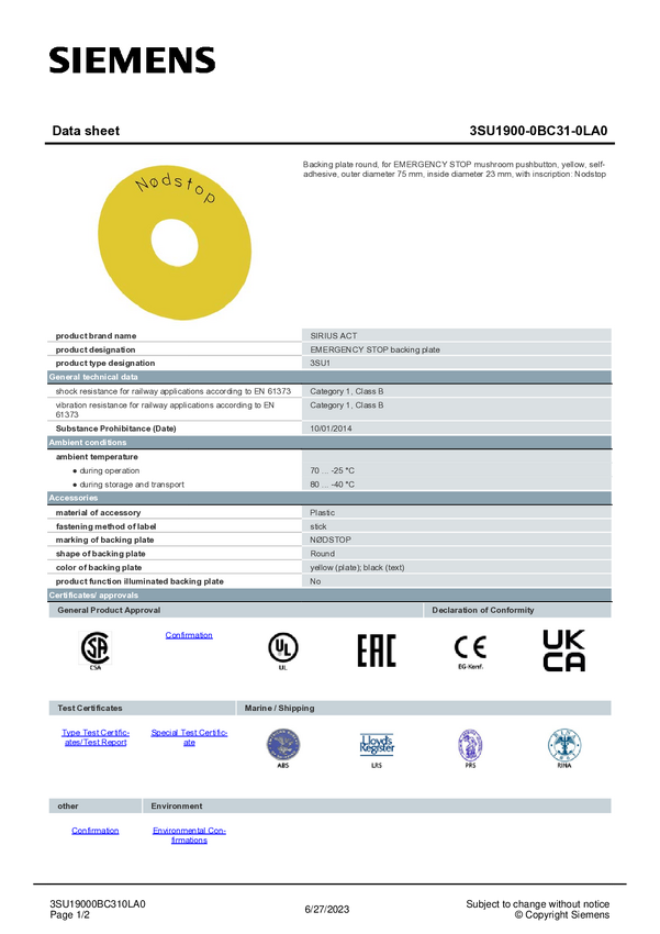 Podkładka indentyfikacyjna Siemens 3SU1900-0BC31-0JA0 (Ø) 75 mm EMERGENZA 10 szt.