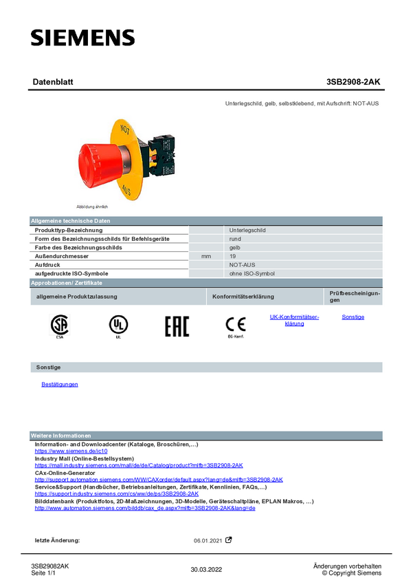 Podkładka indentyfikacyjna Siemens 3SB2908-2AK (Ø) 19 mm NOT-AUS 1 szt.