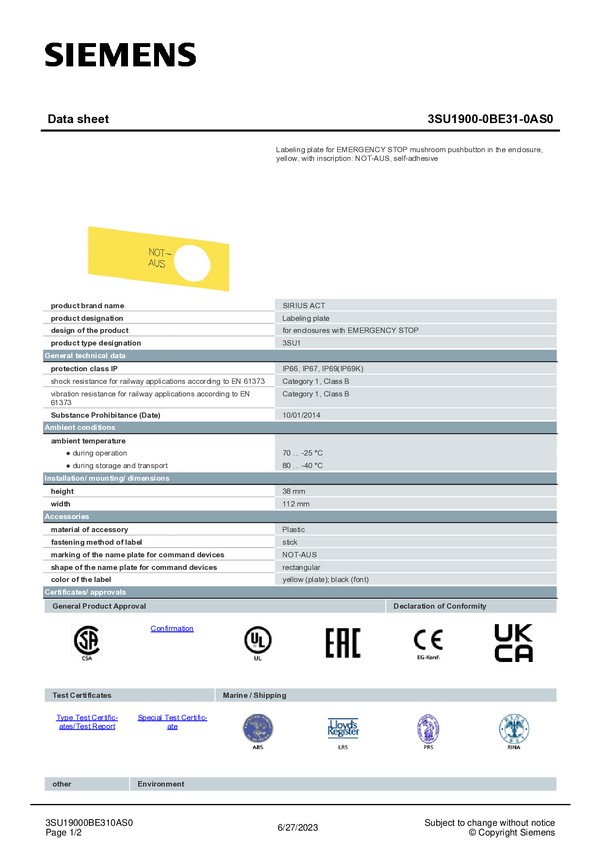 Podkładka indentyfikacyjna Siemens 3SU1900-0BC31-0AS0 (Ø) 75 mm NOT-AUS 10 szt.