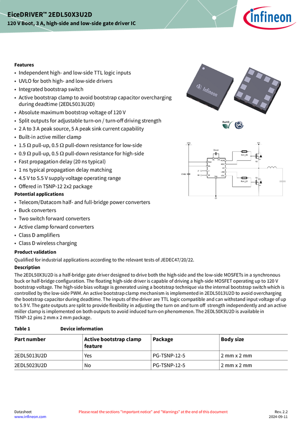 120V HB 2EDL50X3U2D EiceDRIVER™ Drive both high-side and low-side logic level MOSFETs in a half-bridge configuration. 120 V bootstrap voltage with integrated bootstrap diode and an active bootstrap clamp mechanism to avoid bootstrap capacitor overcharge during deadtime. with TTL logic compatible inputs and split outputs to provide flexibility in adjusting the turn-on and turn-off strength independently and an active miller clamp is implemented to avoid induced turn-on.