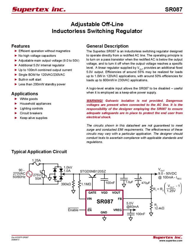 SR087 Datasheet - Adjustable Off-Line Inductorless Switching Regulator (06/27/2014)