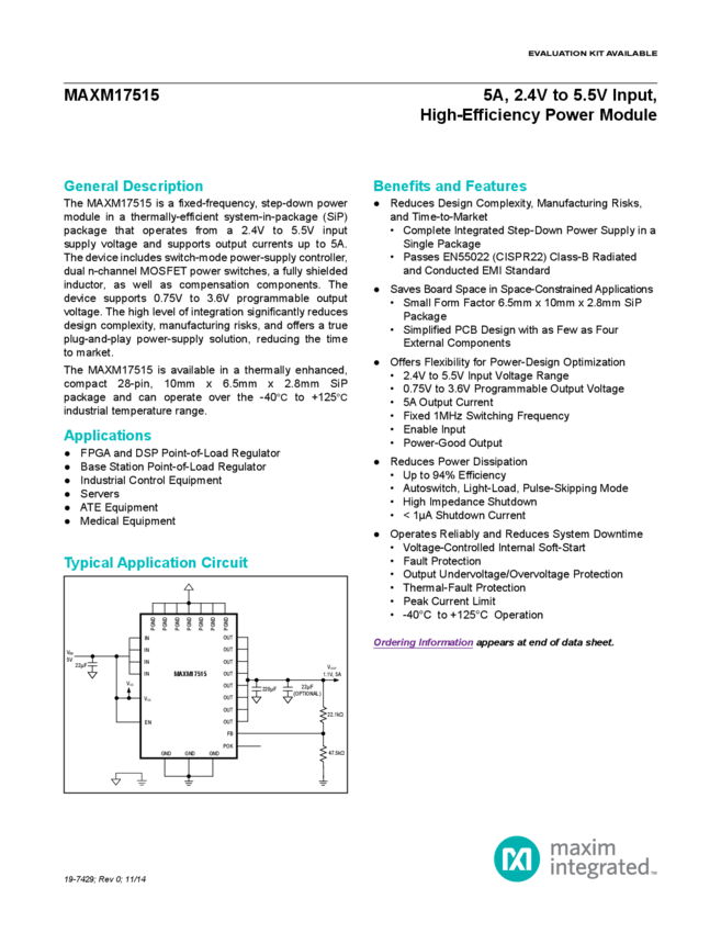 MAXM17515 5A, 2.4V to 5.5V Input, High-Efficiency DC-DC Power Module with Integrated Inductor