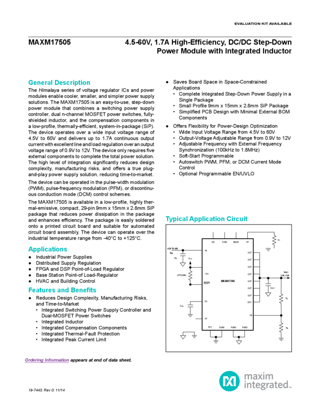 MAXM17505 60V, 1.7A, High-Efficiency, Synchronous Step-Down DC-DC Power Module with Integrated Inductor