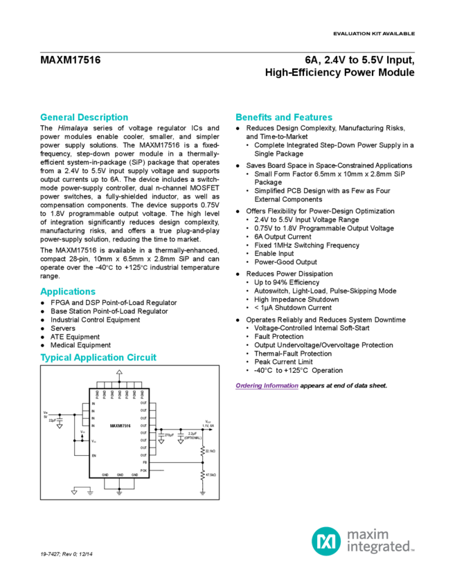 MAXM17516 6A, 2.4V to 5.5V Input, High-Efficiency DC-DC Power Module with Integrated Inductor