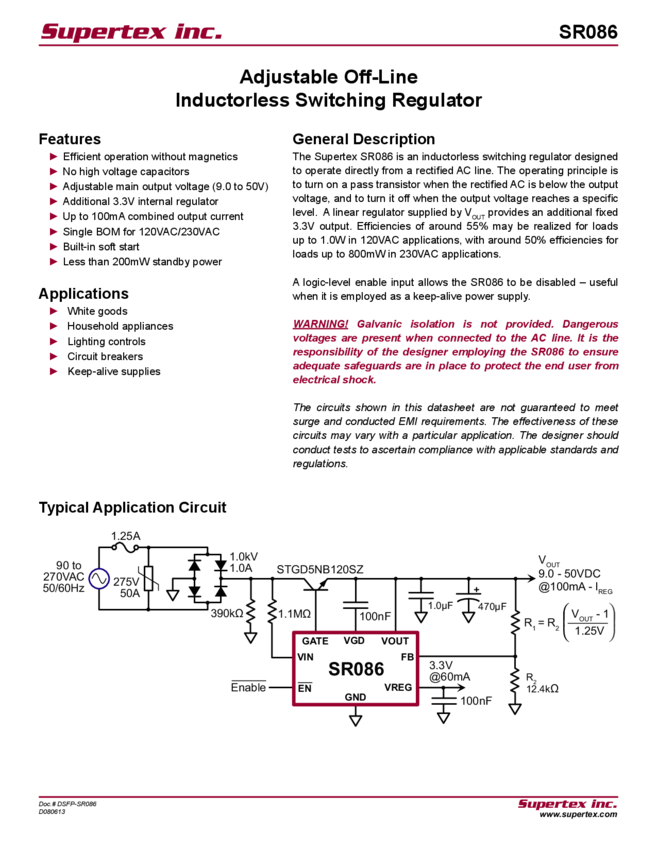 SR086 Datasheet - Adjustable Off-Line Inductorless Switching Regulator (06/27/2014)