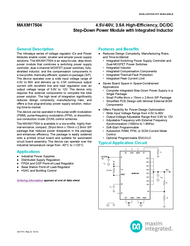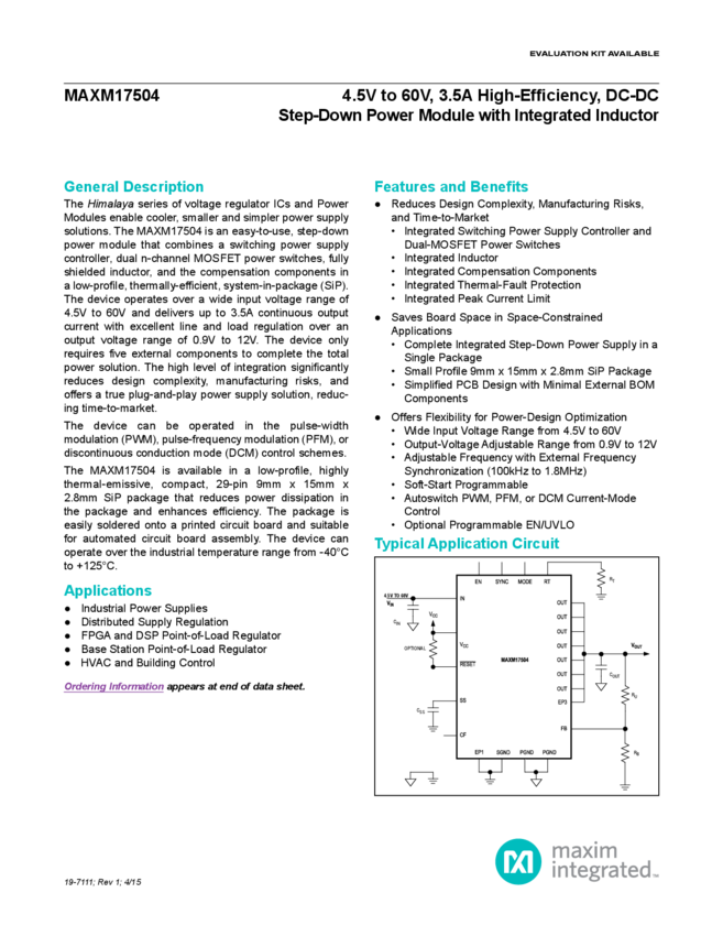 MAXM17504 60V, 3.5A, High-Efficiency, Synchronous Step-Down DC-DC Power Module with Integrated Inductor