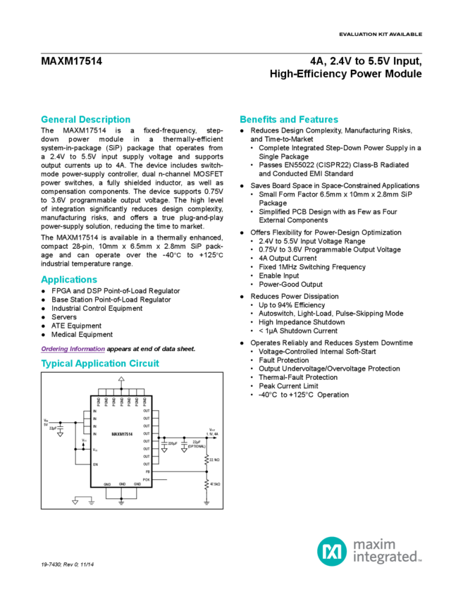 MAXM17514 4A, 2.4V to 5.5V Input, High-Efficiency DC-DC Power Module with Integrated Inductor