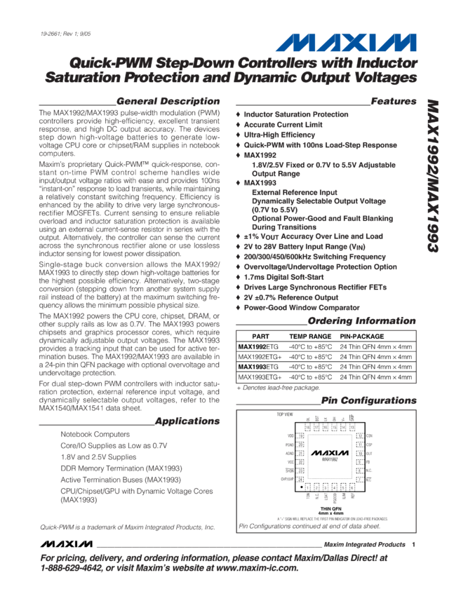 MAX1992, MAX1992ETG, MAX1993 Quick-PWM Step-Down Controllers with Inductor Saturation Protection and Dynamic Output Voltages