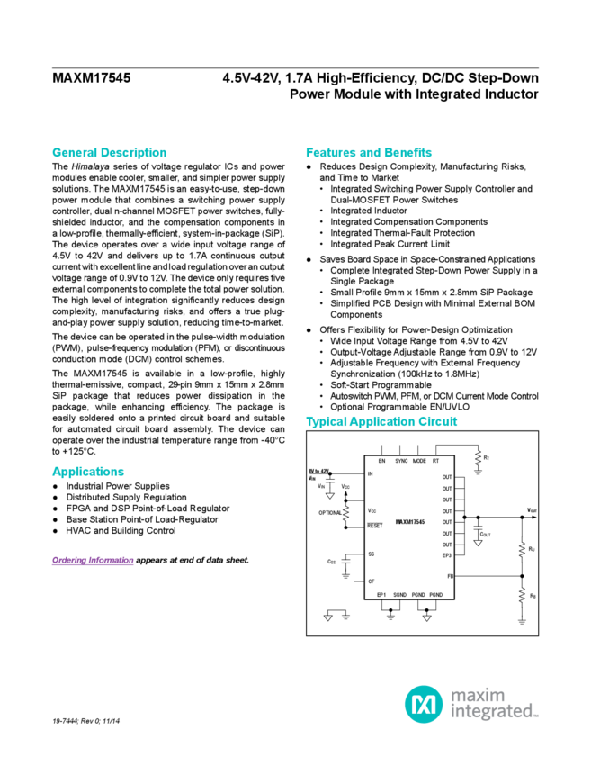 MAXM17545 4.5V-42V 1.7A, High Efficiency Synchronous Step-Down DC-DC Power Module with Integrated Inductor