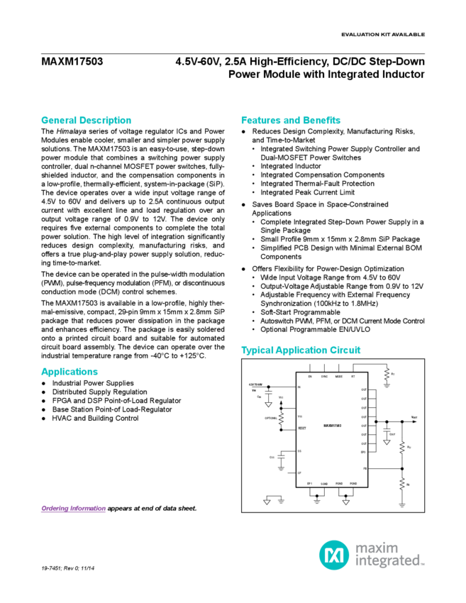 MAXM17503 60V, 2.5A, High Efficiency, Synchronous Step-Down DC-DC Power Module with Integrated Inductor