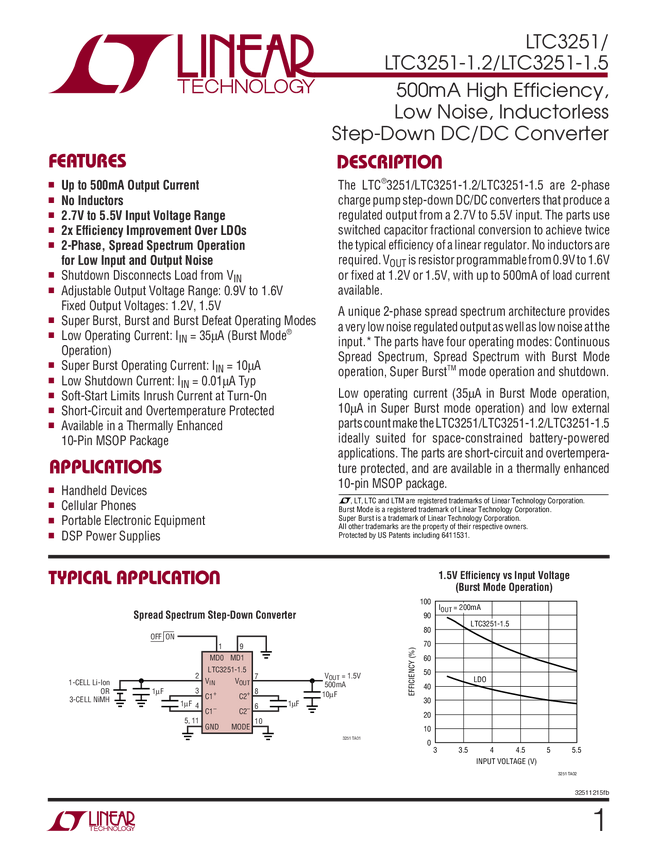 500mA High Efficiency, Low Noise, Inductorless Step-Down DC/DC Converters