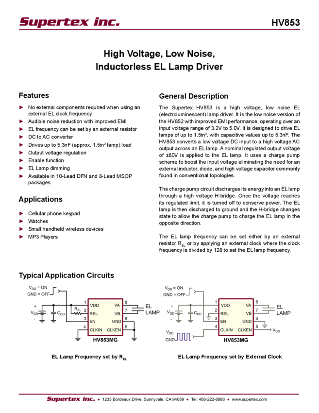 HV853 Datasheet - HV, Low Noise, Inductorless EL Lamp Driver (11/03/2008)