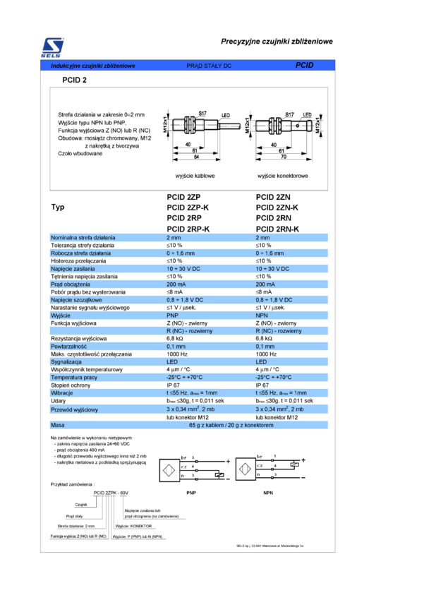 Czujnik zbliżeniowy indukcyjny, obudowa M12, strefa działania 2mm, wyjście NO PNP, kabel 2m, czoło wbudowane