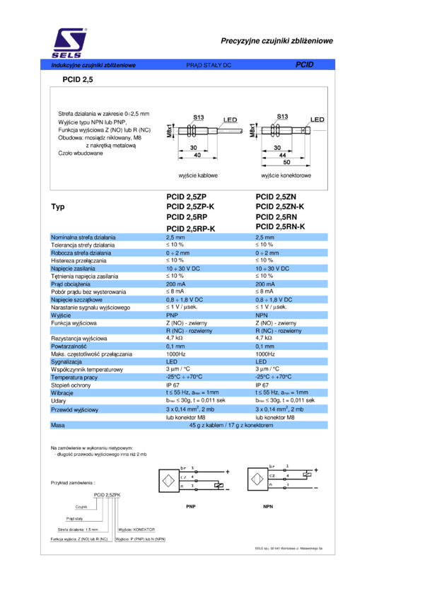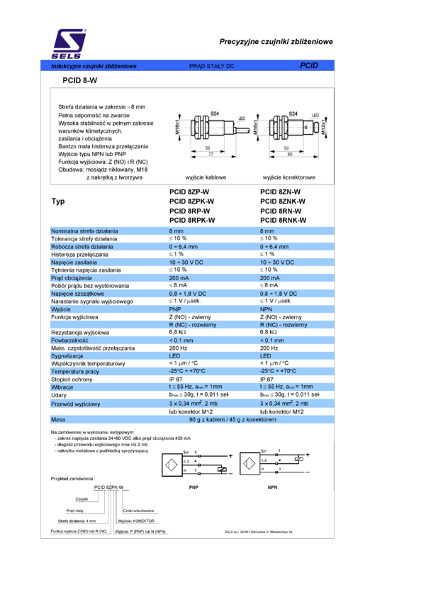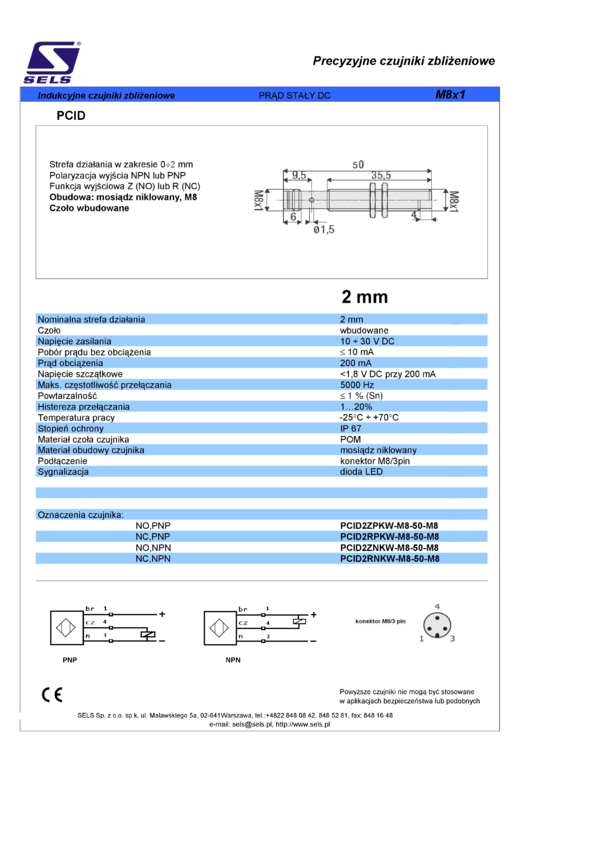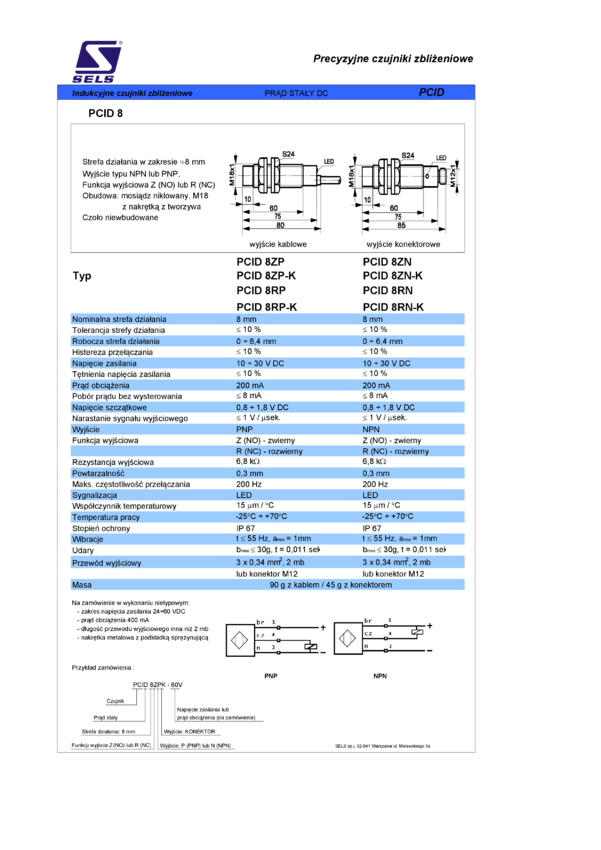 Czujnik zbliżeniowy indukcyjny, obudowa M8, strefa działania 2mm, wyjście NO PNP, konektor M8/3pin, czoło wbudowane