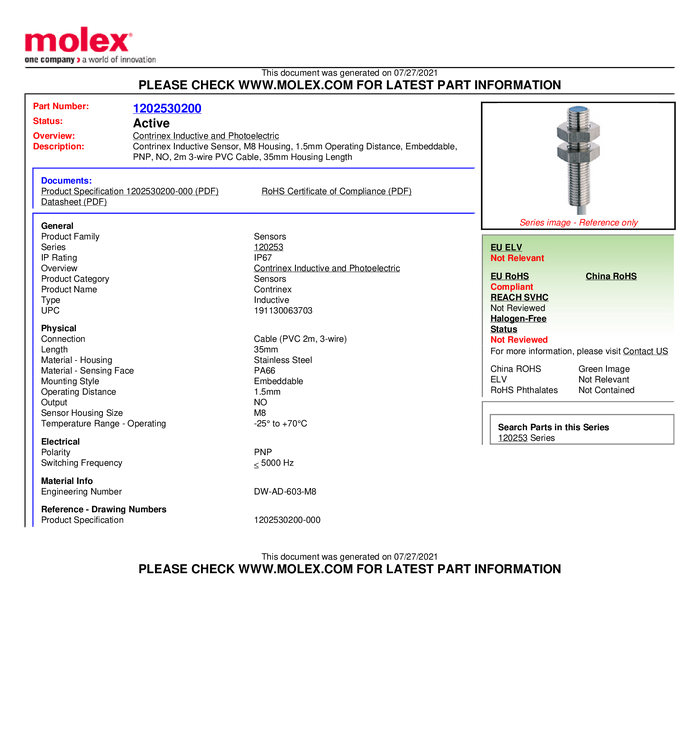 Molex Czujnik indukcyjny M8 podtynkowy PNP Molex WOD Industrial Solution