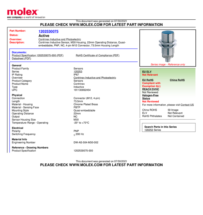 Molex Czujnik indukcyjny M30 quasi podtynkowy PNP Molex WOD
