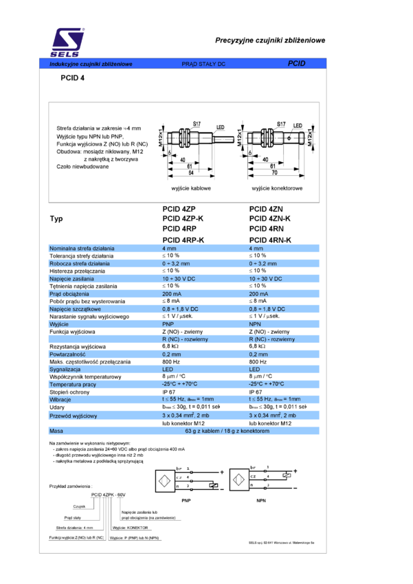 Czujnik zbliżeniowy indukcyjny, obudowa M12, strefa działania 4mm, wyjście NO PNP, kabel 2m, czoło niewbudowane