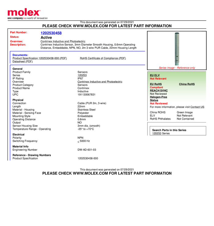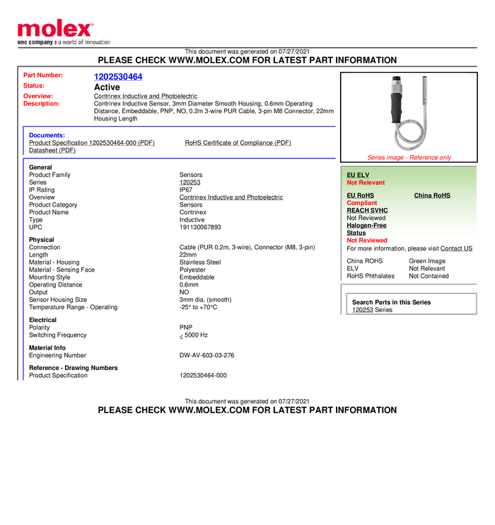 Molex Czujnik indukcyjny M5 podtynkowy PNP Molex WOD Industrial Solution