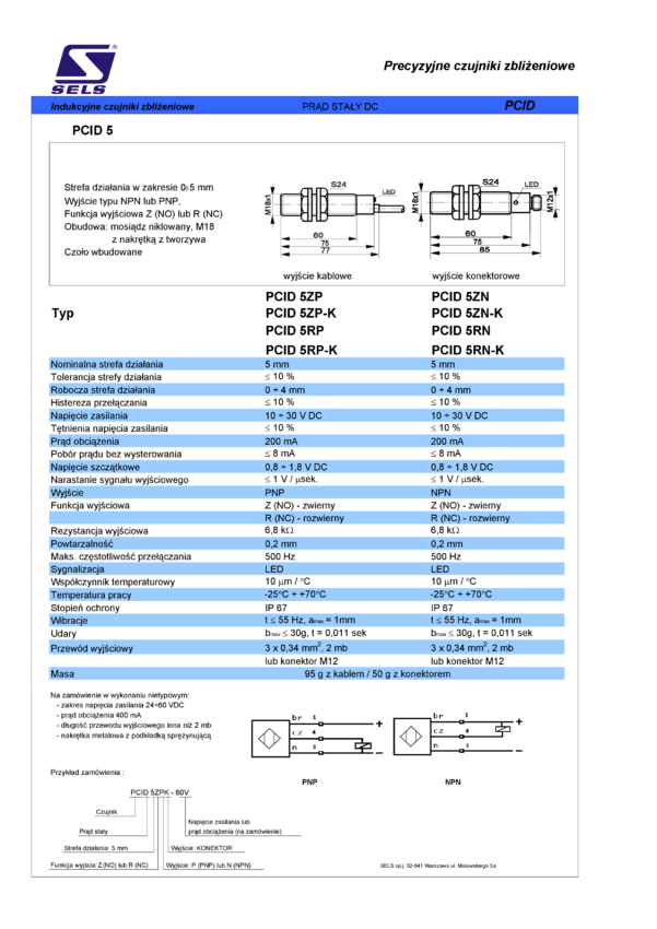 Czujnik zbliżeniowy indukcyjny, obudowa M18, strefa działania 5mm, wyjście NO PNP, kabel 2mb, czoło wbudowane