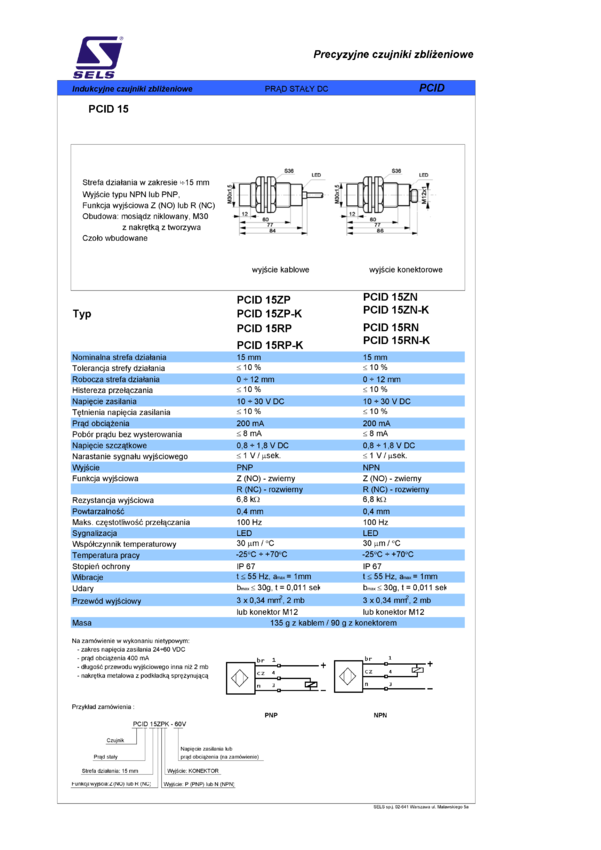 Czujnik zbliżeniowy indukcyjny, obudowa M30, strefa działania 15mm, wyjście NO PNP, kabel 2m, czoło niewbudowane