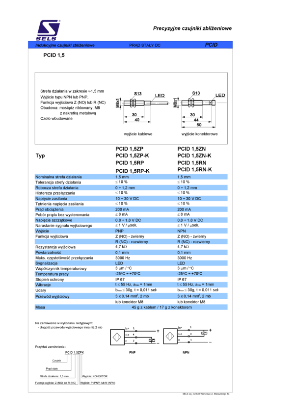 Czujnik zbliżeniowy indukcyjny, obudowa M8, strefa działania 1,5mm, wyjście NO PNP, konektor M8, czoło wbudowane
