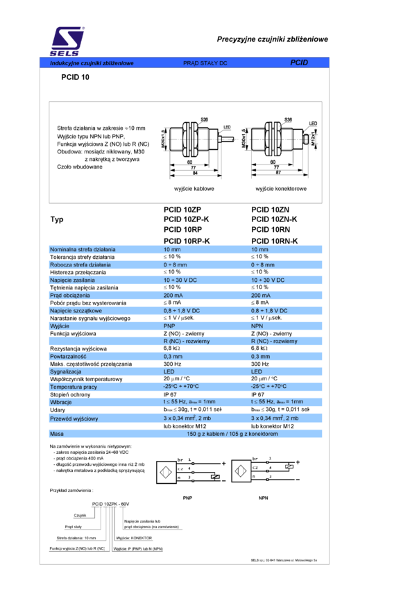 Czujnik zbliżeniowy indukcyjny, obudowa M30, strefa działania 10mm, wyjście NO PNP, kabel 2m, czoło wbudowane
