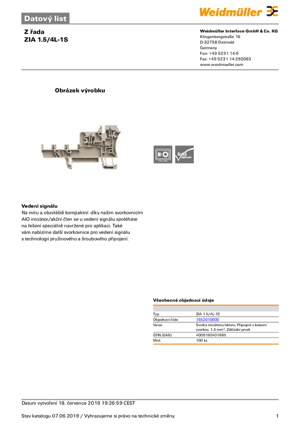 Zacisk siłownika / inicjatora Weidmüller 1652010000 sprężynowe 100 szt.