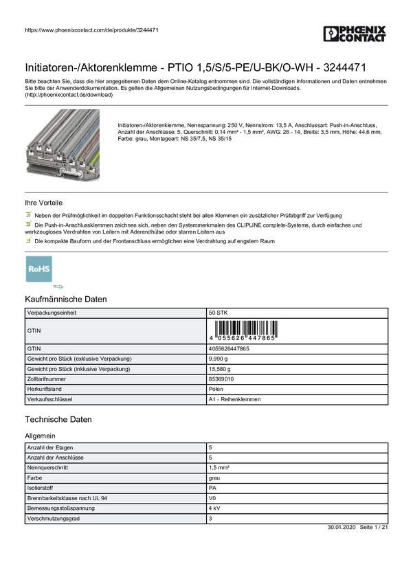 Zacisk siłownika / inicjatora Phoenix Contact 3244471 zacisk push-in 50 szt.