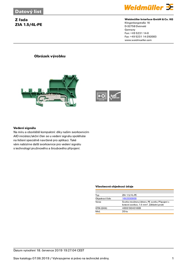 Zacisk siłownika / inicjatora Weidmüller 1652030000 sprężynowe 20 szt.