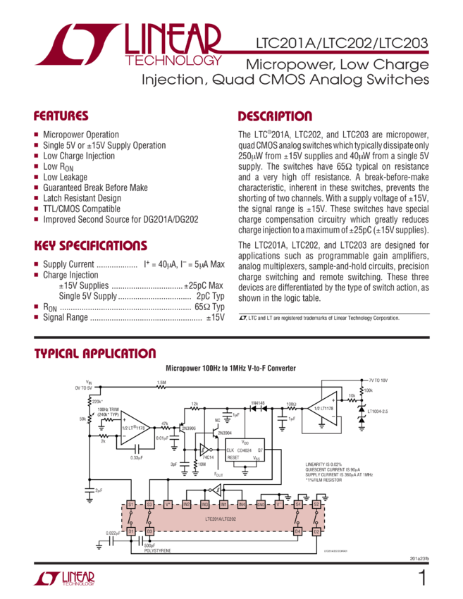 Micropower, Low Charge Injection, Quad CMOS Analog Switches with Data Latches