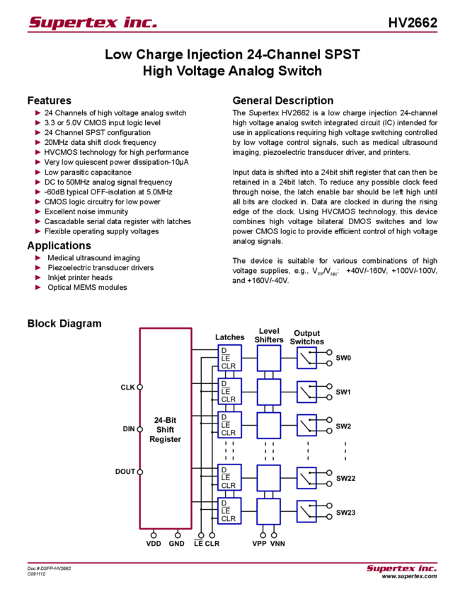 HV2662 Datasheet - Low Charge Injection 24-Channel SPST HV Analog Switch (06/22/2014)