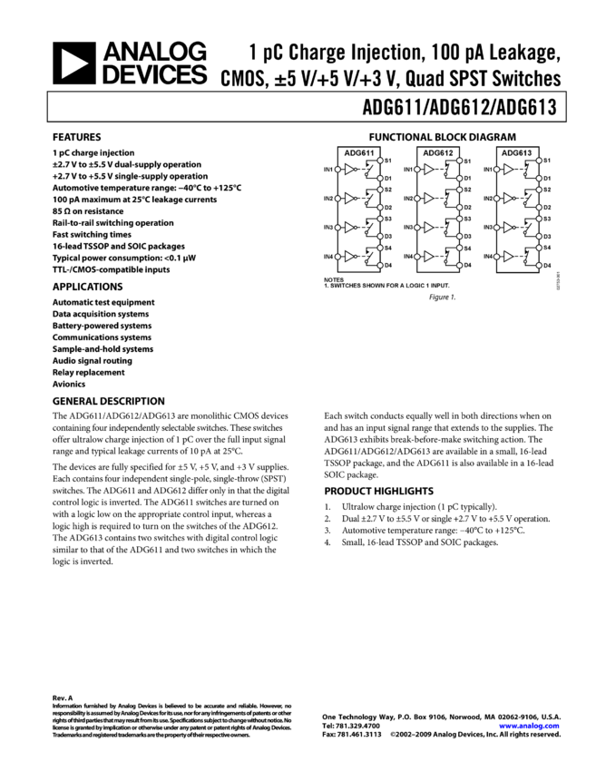 ADG613: 1 pC Charge Injection, 100 pA Leakage, CMOS, ±5 V/+5 V/+3 V, Quad SPST Switches