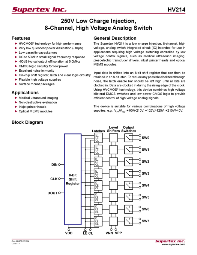 HV214 Datasheet - 250V Low Charge Injection, 8-Channel, HV Analog Switch (06/27/2014)